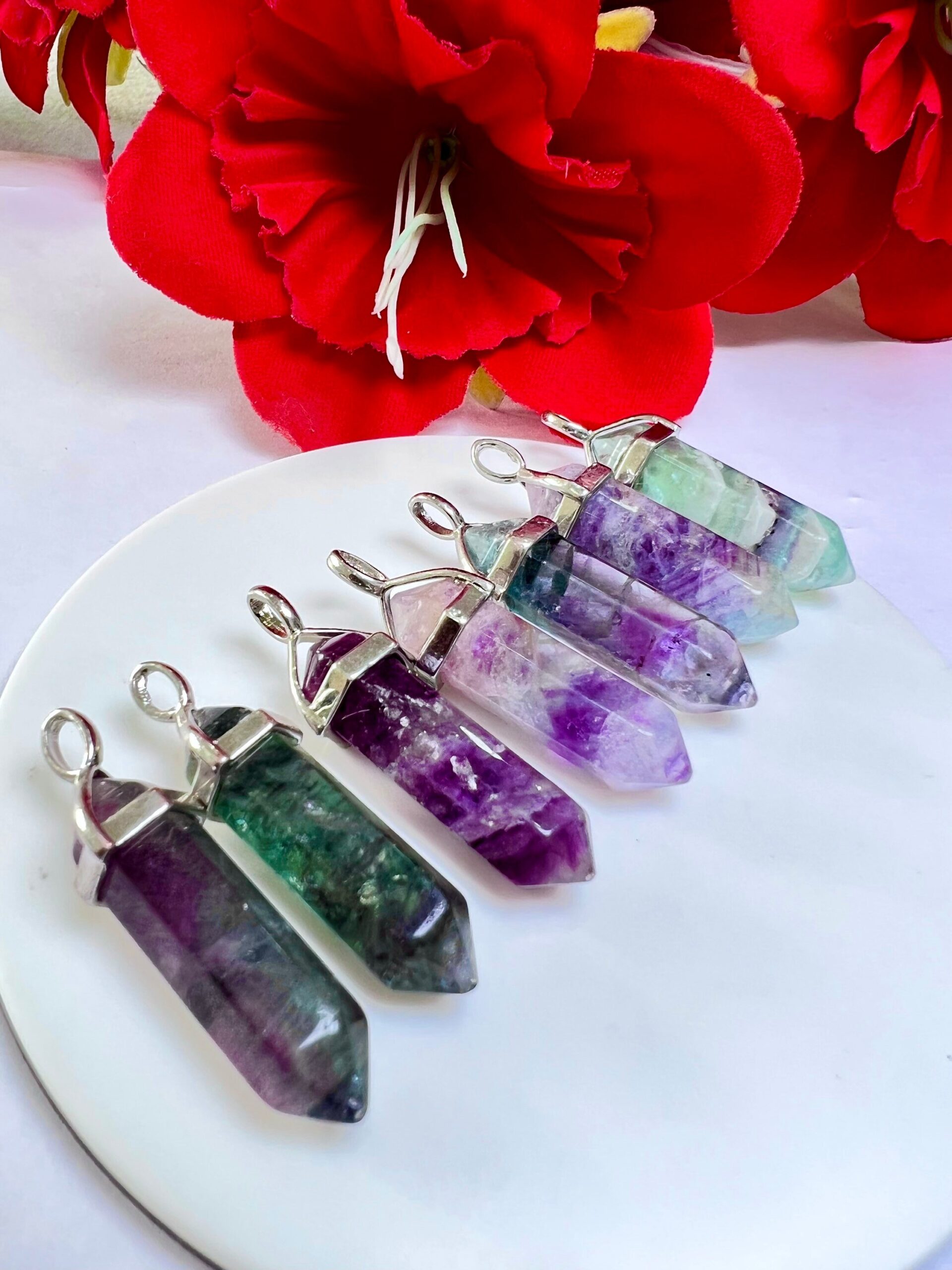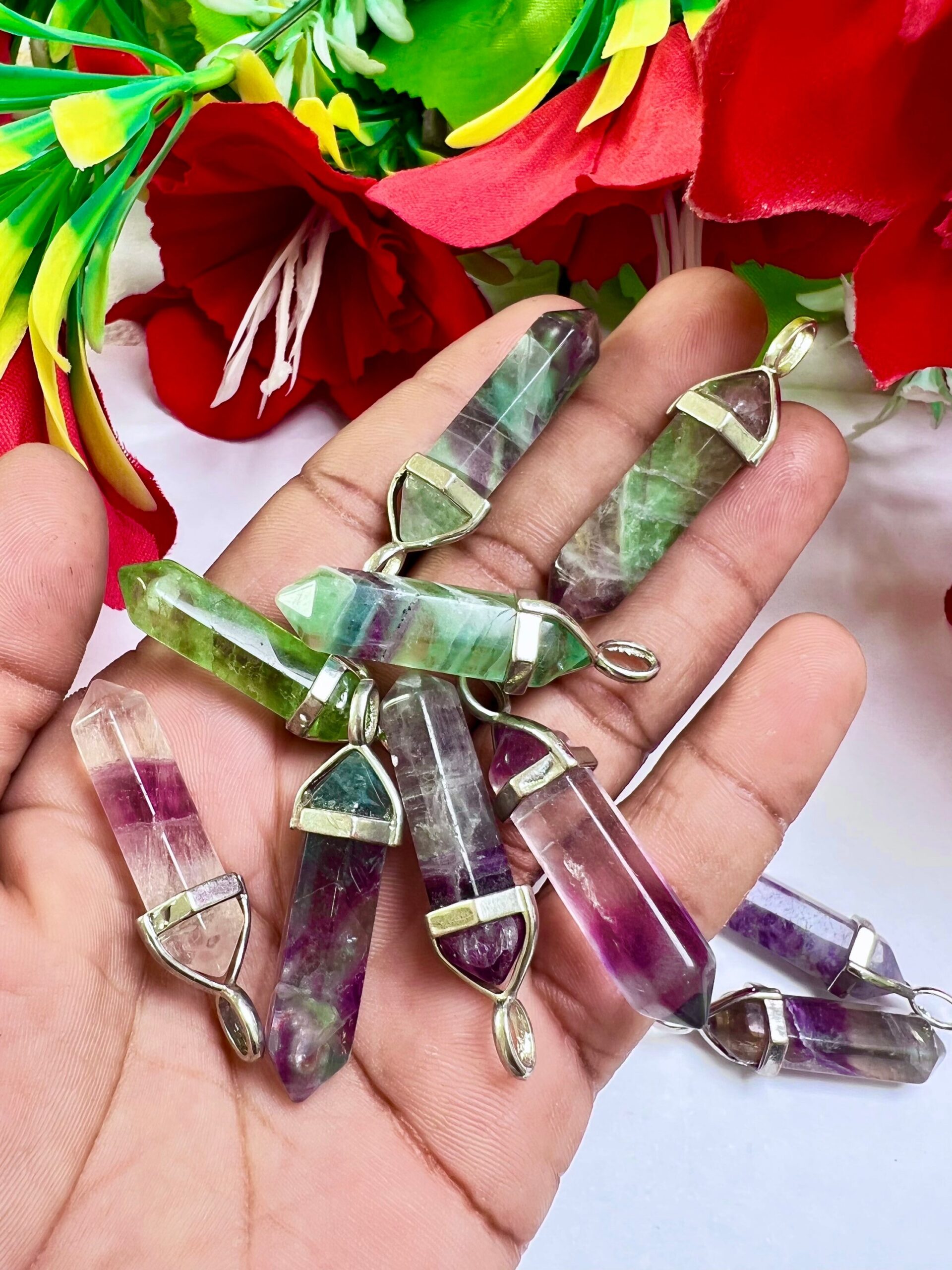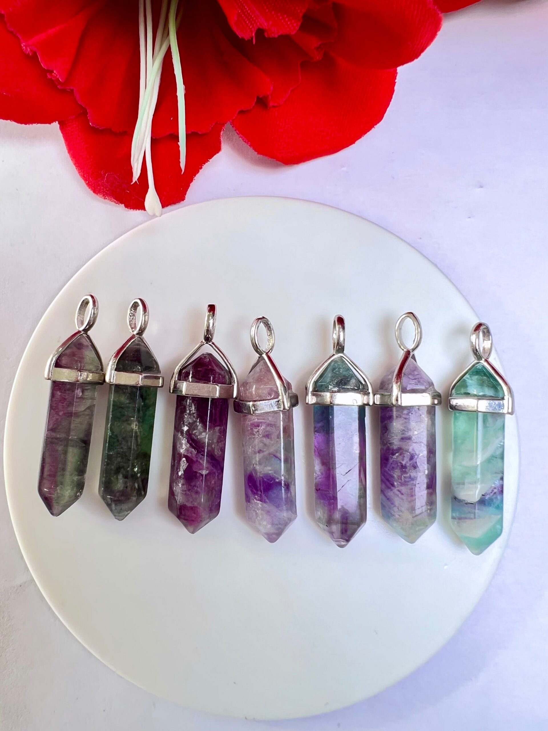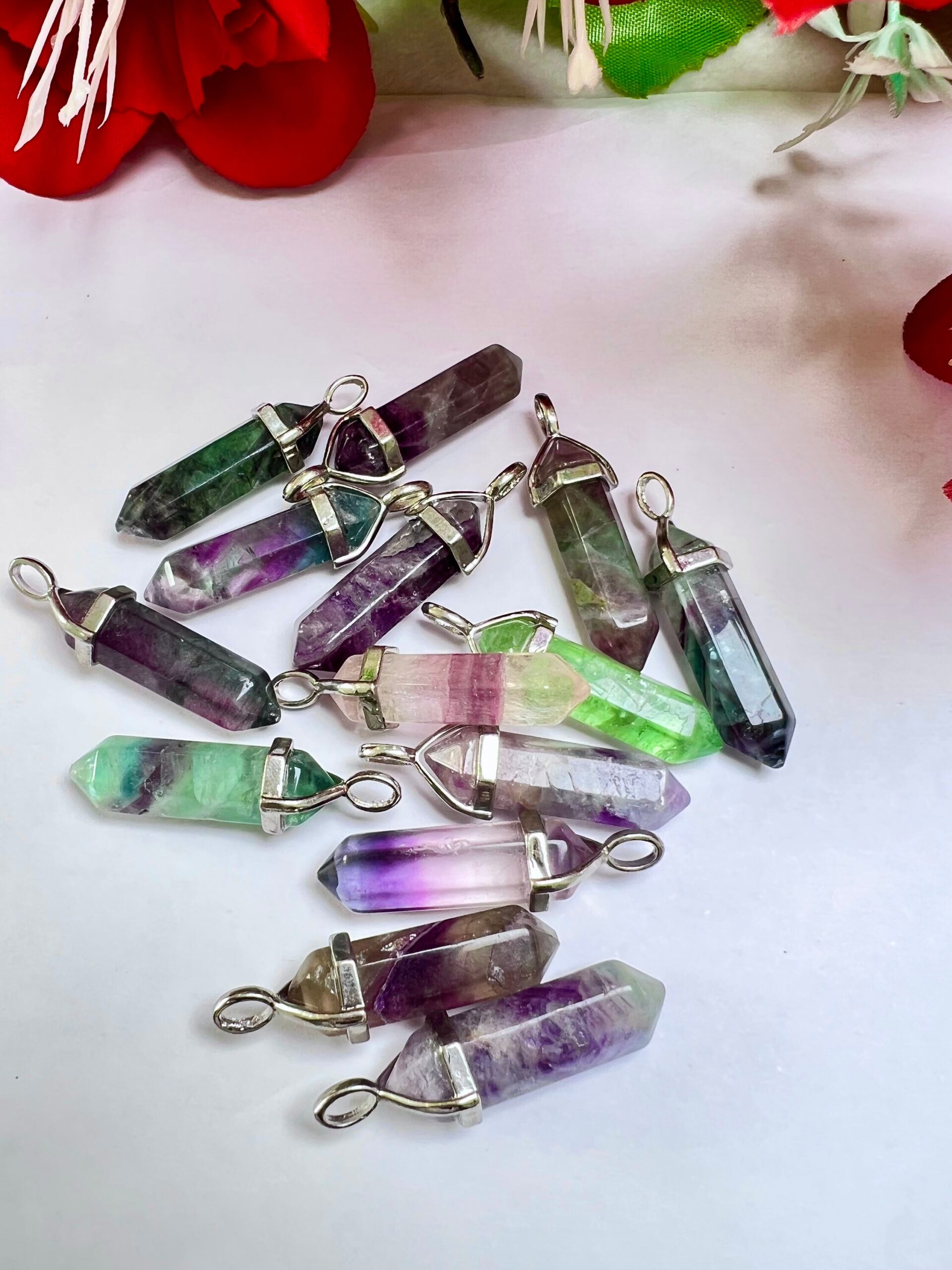 Rainbow Fluorite Stone Healing Double Terminated Point Pendant With Silver Plated Bail Natural stone Pencil Point Pendant