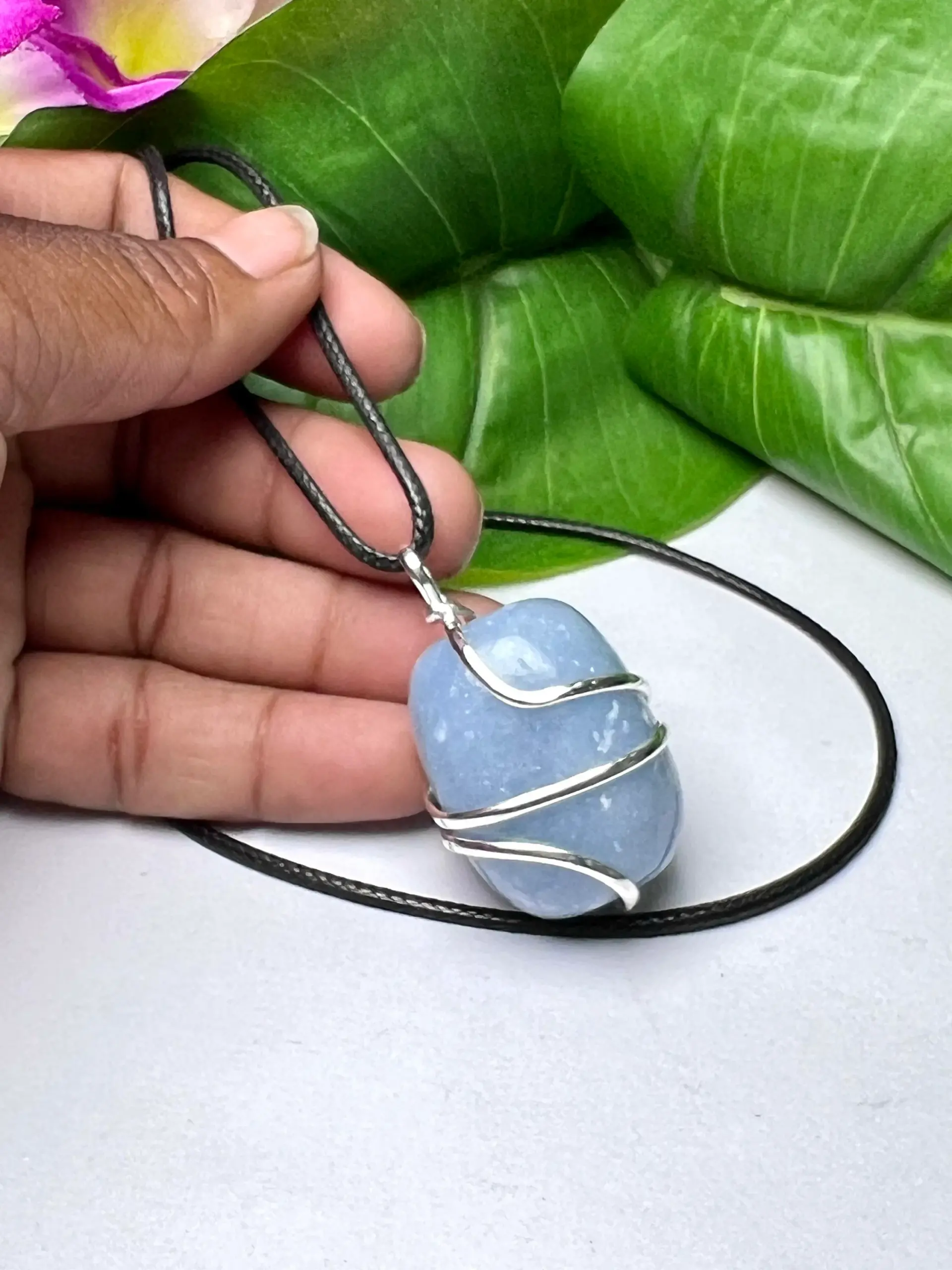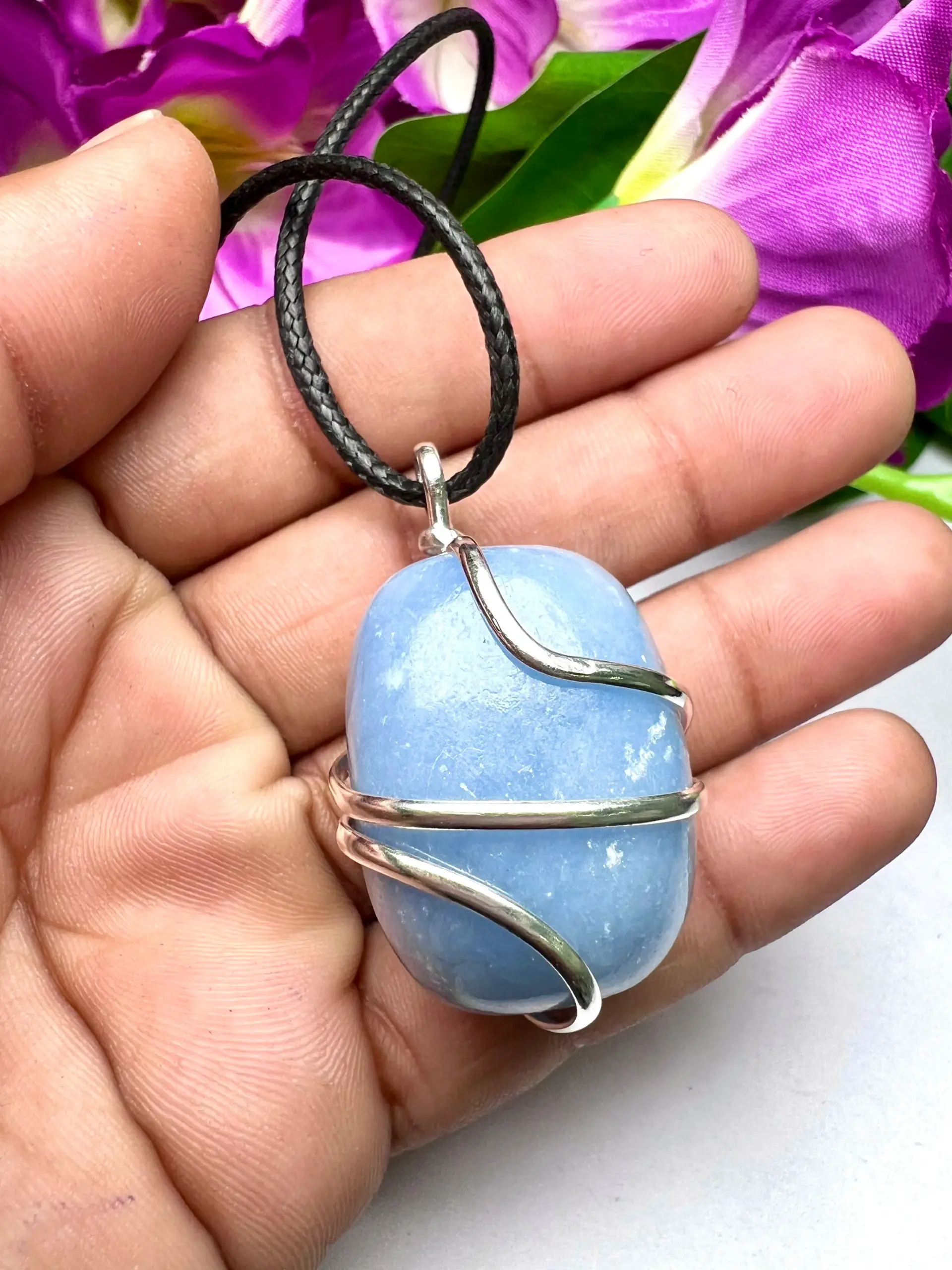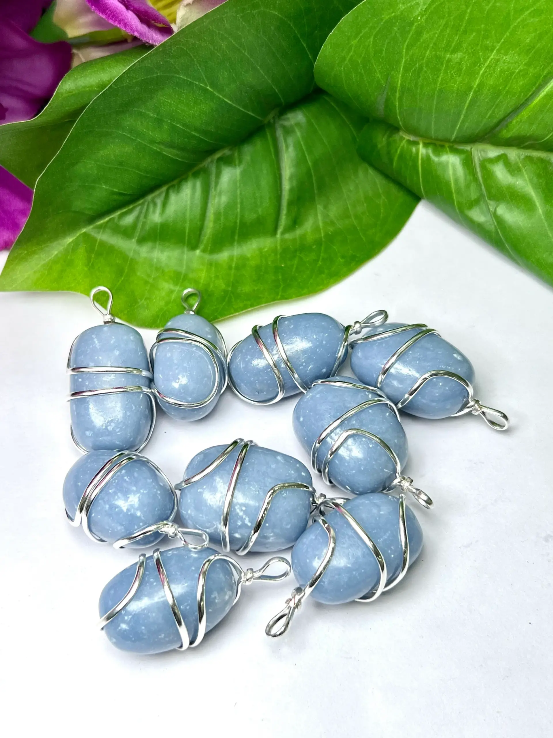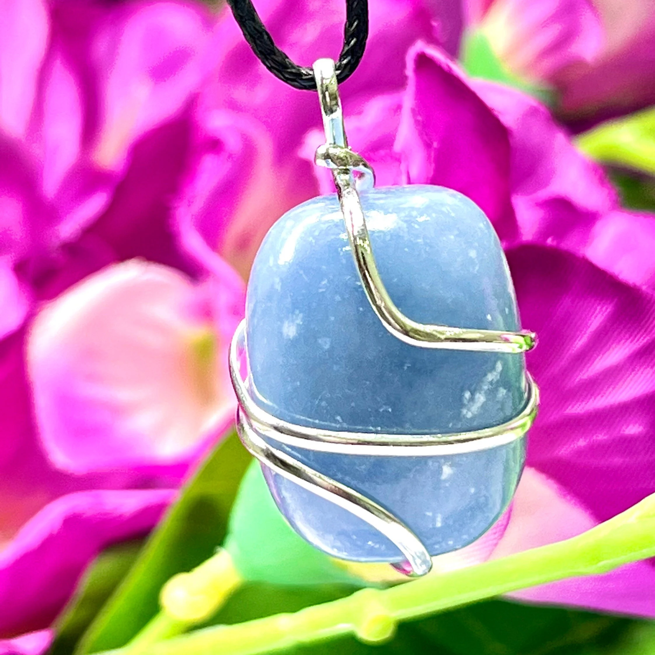 Wire Wrapped Angelite Tumbled Stone Pendant Crystal Pendant, Tumbled Stone Necklace