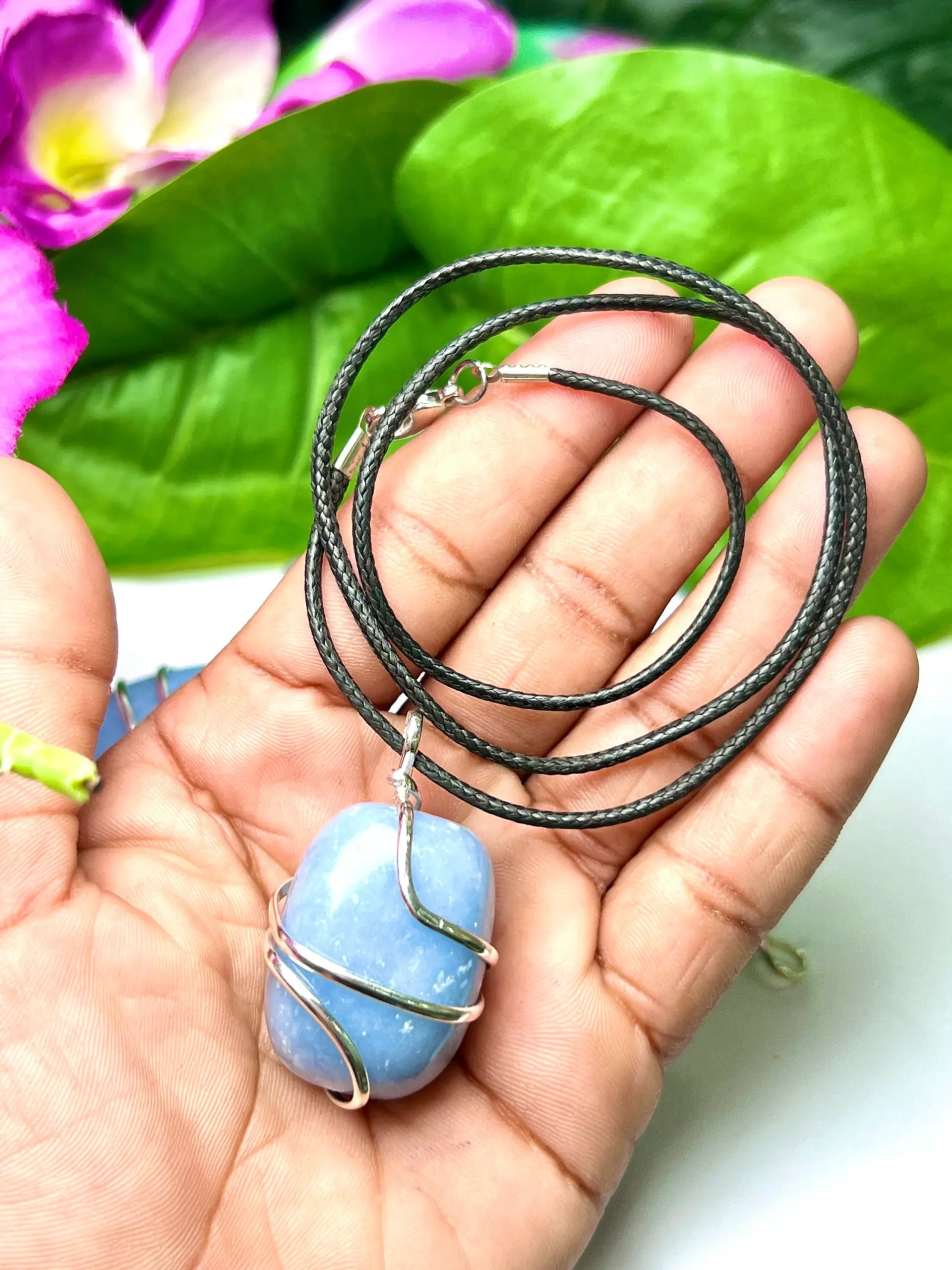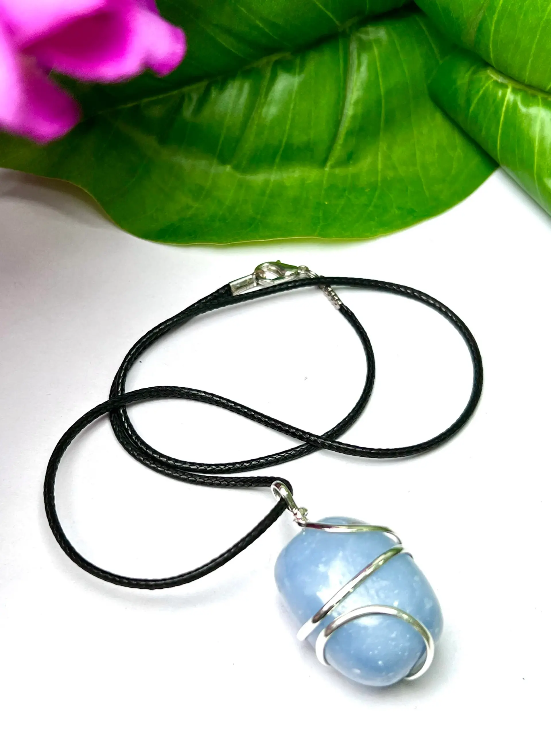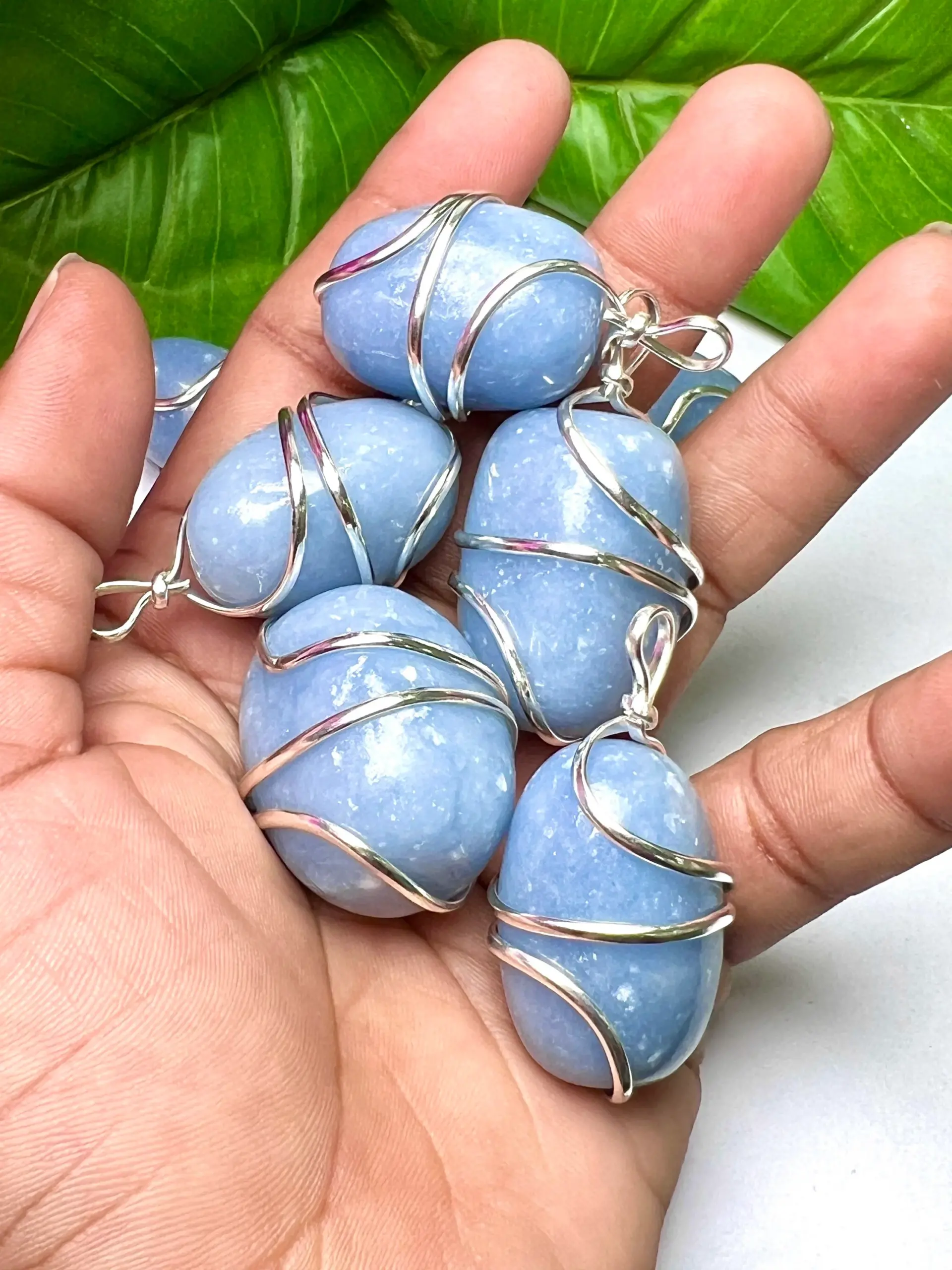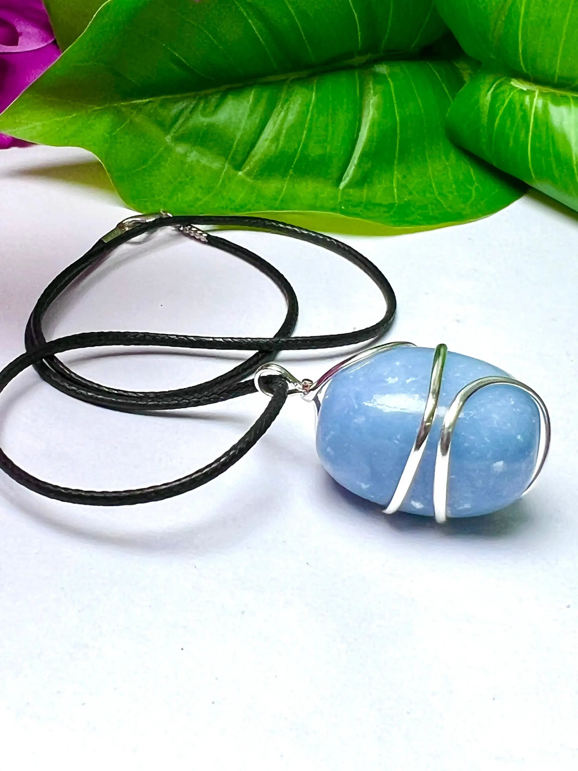 Wire Wrapped Angelite Tumbled Stone Pendant Crystal Pendant, Tumbled Stone Necklace