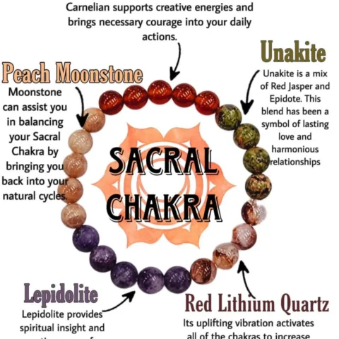 SACRAL Chakra Natural Stone Crystal Bracelet 8mm Red Lithium Quartz, Carnelian,Peach Moonstone, Lepidolite,Unakite Gemstone Healing Bracelet