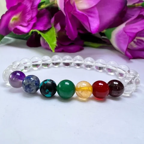 Satyaloka Crystal Quartz with 7 Chakra Healing Bracelet Round Beaded 8MM Bracelet Stretch Bracelet